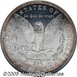 <B>1884<img border='0' src='http://www.heritagecoins.com/images/star.gif' width=10 height=10>$1 PR64 Cameo NGC.</B></I> Nicely toned, particularly at the border areas in shades of deep antique-gold. The fields are nicely mirrored and the devices quite frosty. A few hairlines are seen in the obverse fields, these being the grade-limiting factors.