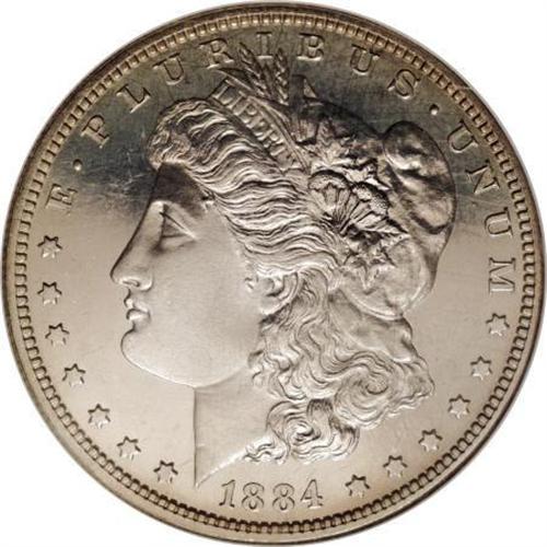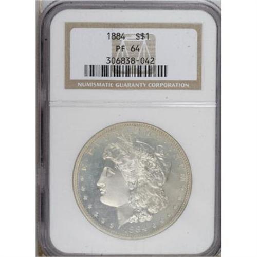 <B>1884 $1 PR64 NGC.</B></I> The satiny motifs appear to stand above the reflective fields of this near-Gem proof. Essentially untoned surfaces display exquisitely struck design elements, including full definition in the hair at Liberty's ear and the eagle's breast feathers. Some light wispy marks in the fields define the grade. Census: 52 in 64, 51 finer (10/07).<BR><BR><B>Coin Engraver:</B> George T. Morgan<BR><BR><b>Shipping:</b> Coins & Currency (<a target="_blank" href="http://www.heritageauctions.com/common/shipping.php">view shipping information</a>)