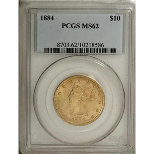 <B>1884 $10 MS62 PCGS.</B></I> Honey-gold lustrous surfaces display light, scattered abrasions, especially on the obverse. The design elements are well brought up throughout on this yellow-orange survivor. Population: 43 in 62, 31 finer (12/07).<BR><BR><B>Coin Engraver:</B> Christian Gobrecht<BR><BR><b>Shipping:</b> Coins & Currency (<a target="_blank" href="http://www.heritageauctions.com/common/shipping.php">view shipping information</a>)