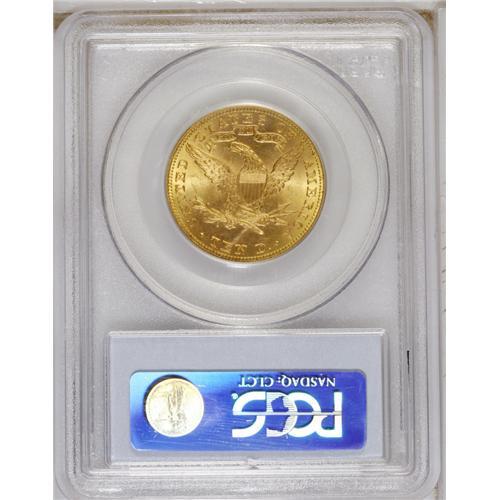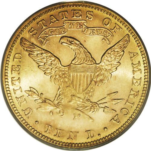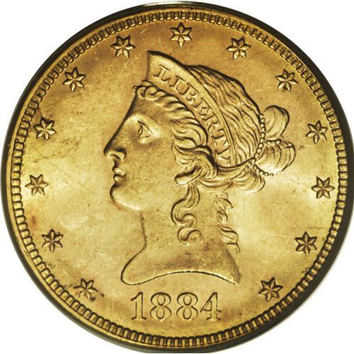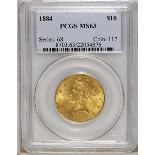 <B>1884 $10 MS63 PCGS.</B></I> A better date coin with a mintage of fewer than 77,000 pieces, difficult to find in Mint State. This example is bright, with shimmering luster and lovely orange-gold coloration. Lightly marked with one or two small alloy spots near the periphery, on each side. Population: 24 in 63, 7 finer (11/06).<BR><BR><b>Shipping:</b> Coin/Currency (<a target="_blank" href="http://www.heritageauctions.com/common/shipping.php">view shipping information</a>)