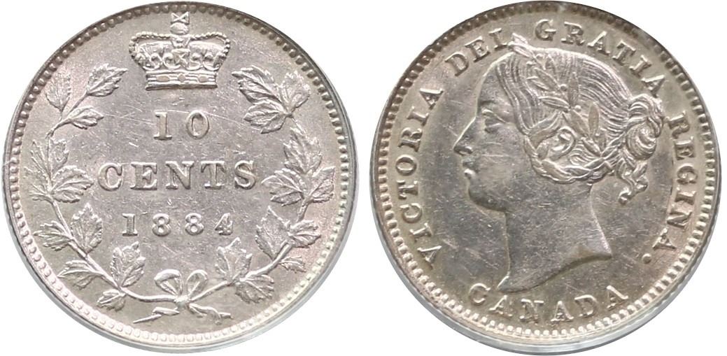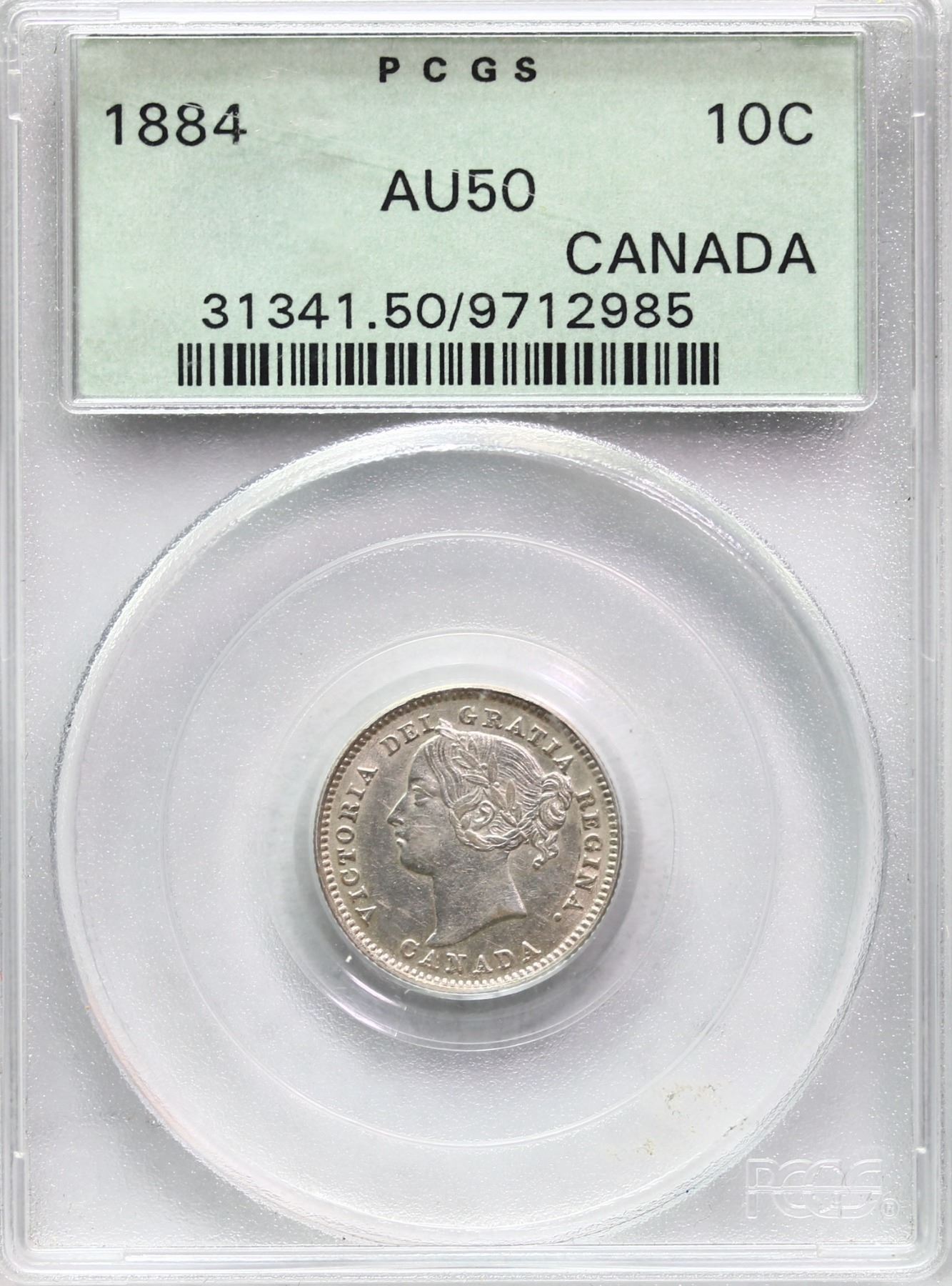 1884 10¢ PCGS About Uncirculated-50 Brilliant and lustrous. Rare key date.