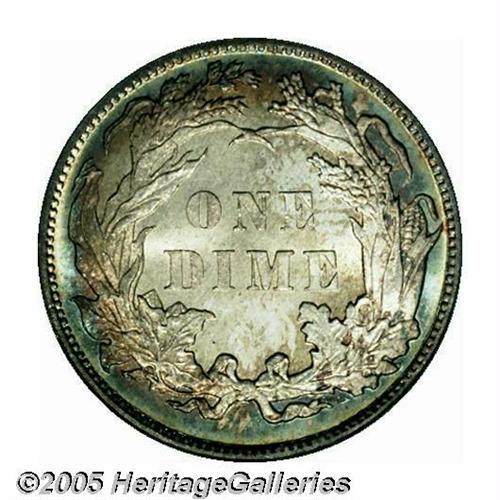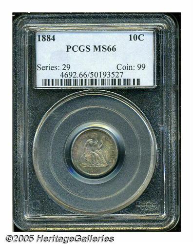 <B>1884<10C> MS66 PCGS.</B></I> Deeply toned with crimson-red, emerald-green, and hints of golden patina. Well defined for the issue with a few dark speckles visible on each side. A well preserved Gem. Population: 26 in 66, 21 finer (4/05).