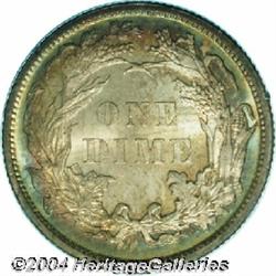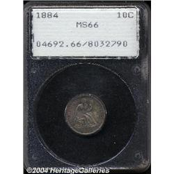 <B>1884<10C> MS66 PCGS.</B></I> This is a Premium Gem housed in a first generation PCGS holder. Although finer examples do exist, this dime has exceptional aesthetic appeal. The obverse has intermingled lilac, olive, and teal. On the reverse, the central areas have light ivory color surrounded by gold, sea-green, and amber. Although not fully struck, this example has considerable detail including most of Liberty's head and hair. <BR><BR><B>Important notice:</B> Heritage usually auctions material at the rate of 200-250 lots per hour. On some occasions eBay Live bid software or the Internet may not be able to keep up with the pace of the auction. We recommend placing a realistic absentee bid now as insurance to avoid disappointment. Occasionally the auctioneer may eliminate or reject an eBay Live bid, and the auctioneer may also reopen a lot after the close of the eBay live bidding (usually because we missed an audience bid), and may reject your bid even if it shows you as the winning bidder. By bidding via eBay Live, you agree that Heritage may award the lot to another bidder at its sole discretion under the circumstances described above or any other reasonable circumstances. Since eBay bids are not shown to us until we open the lot on the floor, we treat those bids just like floor bids. In most cases the floor responds before the eBay bid is presented to us, due to Internet lag time, so for consistency we have made it a policy that floor bids are always considered first over tie eBay live bids. Also please note that all Heritage lots purchased through eBay Live carry a 20% Buyer's Premium. Please make sure you read the Terms and Conditions before you bid.