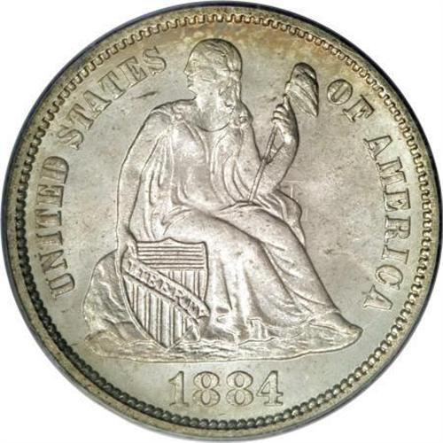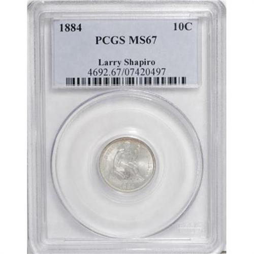 <B>1884 10C MS67 PCGS.</B></I> Ex: Larry Shapiro. A simply outstanding example, practically stone-white with just a touch of gold-orange at the left reverse rim. The solidly struck devices display no mentionable marks to the unaided eye, and the fields are equally clean. A great candidate for the finest of 19th century type sets. PCGS has graded only one coin finer (6/07).<BR><BR><B>Coin Engraver:</B> Christian Gobrecht<BR><BR><b>Shipping:</b> Coins & Currency (<a target="_blank" href="http://www.heritageauctions.com/common/shipping.php">view shipping information</a>)