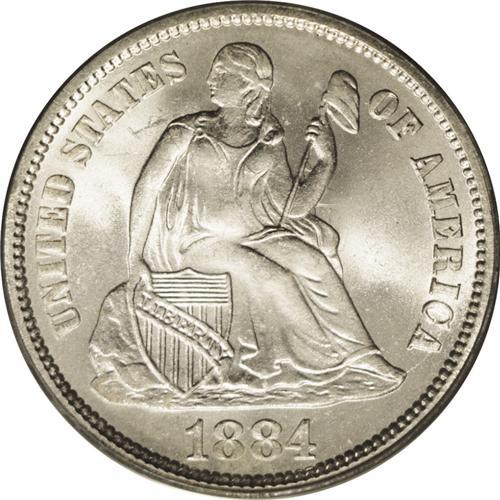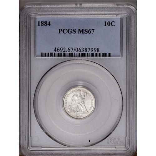 <B>1884<10C> MS67 PCGS.</B></I> With an original mintage of 3.3 million pieces, it is little wonder that the 1884 is popular among type collectors. Only the most advanced type collectors, however, will have the opportunity to acquire an MS67 representative. Both sides ripple with thick, frosty mint luster. There are no mentionable surface blemishes, and the outward appearance is one of radiant brilliance. Thin crescents of extremely pale golden color, nonetheless, cling to selected border areas. Population: 24 in 67, 1 finer (4/06).
