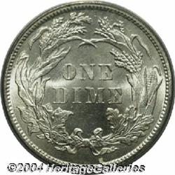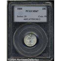 <B>1884<10C> MS67 PCGS.</B></I> A glittering Gem of a Seated Dime type coin. The strike is full and sharp, with the head and wreath showing their full details. The surfaces are quite remarkable as they are white and satiny--literally as nice as the day it was struck. Population: 21 in 67, 1 finer (9/04). <BR><BR><B>Important notice:</B> Heritage usually auctions material at the rate of 200-250 lots per hour. On some occasions eBay Live bid software or the Internet may not be able to keep up with the pace of the auction. We recommend placing a realistic absentee bid now as insurance to avoid disappointment. Occasionally the auctioneer may eliminate or reject an eBay Live bid, and the auctioneer may also reopen a lot after the close of the eBay live bidding (usually because we missed an audience bid), and may reject your bid even if it shows you as the winning bidder. By bidding via eBay Live, you agree that Heritage may award the lot to another bidder at its sole discretion under the circumstances described above or any other reasonable circumstances. Since eBay bids are not shown to us until we open the lot on the floor, we treat those bids just like floor bids. In most cases the floor responds before the eBay bid is presented to us, due to Internet lag time, so for consistency we have made it a policy that floor bids are always considered first over tie eBay live bids. Also please note that all Heritage lots purchased through eBay Live carry a 20% Buyer's Premium. Please make sure you read the Terms and Conditions before you bid.