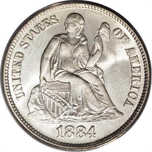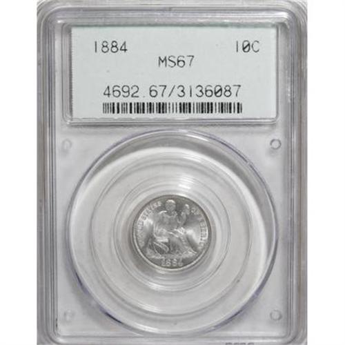 <B>1884 10C MS67 PCGS.</B></I> A lustrous and beautiful Superb Gem. Essentially untoned and gorgeously preserved. The strike brings up nearly all of the design. Certified in an old green label holder. The reverse border exhibits several spindly die cracks. A splendid representative of the Seated type. Population: 20 in 67, 1 finer (1/08).<BR><BR><B>Coin Engraver:</B> Christian Gobrecht<BR><BR><b>Shipping:</b> Coins & Currency (<a target="_blank" href="http://www.heritageauctions.com/common/shipping.php">view shipping information</a>)