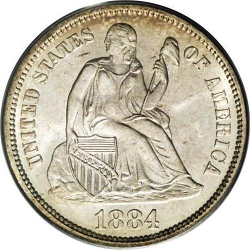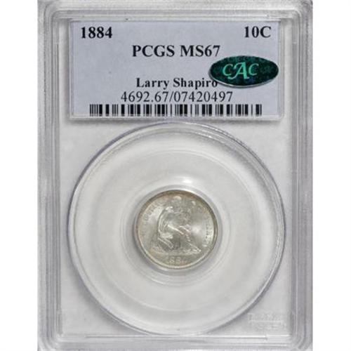 <B>1884 10C MS67 PCGS. CAC.</B></I> Ex: Larry Shapiro. A simply outstanding example, practically stone-white with just a touch of gold-orange at the left reverse rim. The solidly struck devices display no mentionable marks to the unaided eye, and the fields are equally clean. A great candidate for the finest of 19th century type sets. Population: 20 in 67, 1 finer (1/08).<BR><BR><B>Coin Engraver:</B> Christian Gobrecht<BR><BR><b>Shipping:</b> Coins & Currency (<a target="_blank" href="http://www.heritageauctions.com/common/shipping.php">view shipping information</a>)