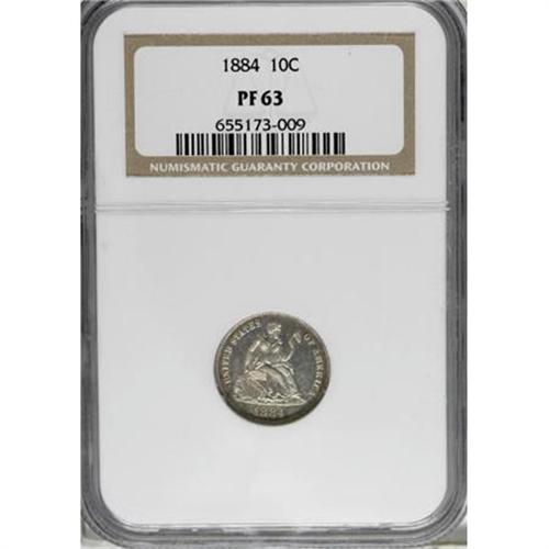 <B>1884 10C PR63 NGC.</B></I> NGC Census: (29/184). PCGS Population (47/158). Mintage: 875. Numismedia Wsl. Price for NGC/PCGS coin in PR63: $450. (#4781)<BR><BR><B>Coin Engraver:</B> Christian Gobrecht<BR><BR><b>Shipping:</b> Coins & Currency (<a target="_blank" href="http://www.heritageauctions.com/common/shipping.php">view shipping information</a>)