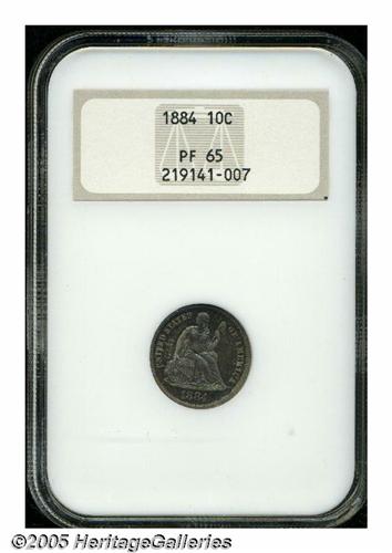 <B>1884<10C> PR65 NGC.</B></I> A pleasing assemblage of cobalt-blue, golden-orange, beige, and crimson patination. The design elements are boldly impressed, with just some of the wheat kernels in the upper left (facing) wreath exhibiting a touch of softness. The eye appeal of this piece is further enhanced by the noticeable contrast between the motifs and the reflective fields. The surfaces are very well preserved, revealing no mentionable marks.