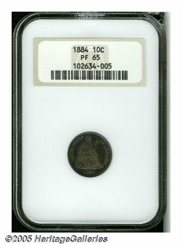 <B>1884<10C> PR65 NGC.</B></I> Vivid electric-blue, ruby, and orange colors illuminate this crisply struck and impressive specimen. A scant 875 proofs were struck, not many among which can match the eye appeal of the present piece.