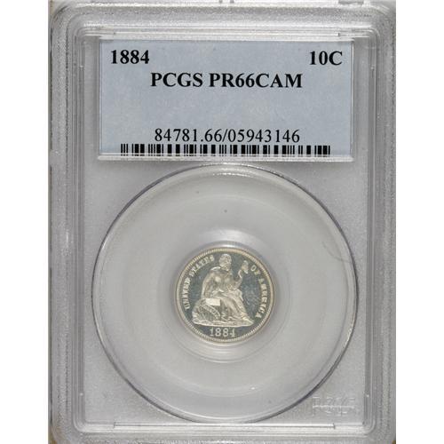 <B>1884 10C PR66 Cameo PCGS.</B></I> Frosty devices contrast favorably with the glassy fields. A crisply struck and splendid specimen. Only 875 proofs were issued. Population: 13 in 66 Cameo, 10 finer (3/07).<BR><BR><b>Shipping:</b> Coins & Currency (<a target="_blank" href="http://www.heritageauctions.com/common/shipping.php">view shipping information</a>)