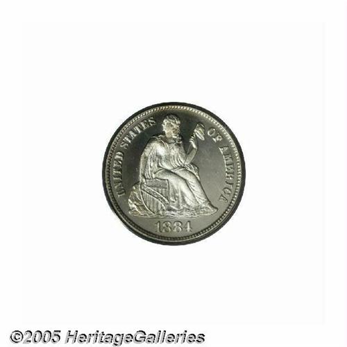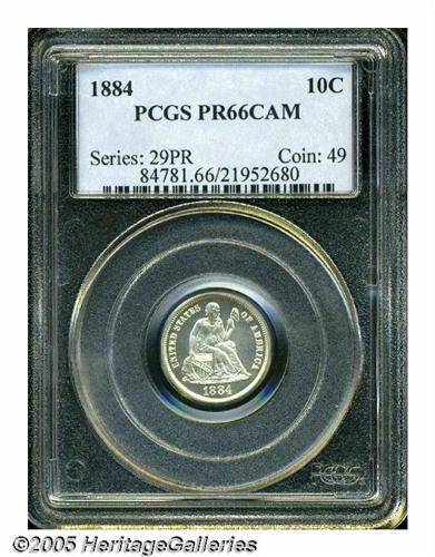 <B>1884<10C> PR66 Cameo PCGS.</B></I> The icy-white devices exhibit impressive contrast, and approach a Deep Cameo designation. A crisply struck, lightly toned, and flashy premium Gem. Nearly immaculate, a dash of struck-in grease beneath the M in DIME will identify future appearances of this lovely specimen. Population: 12 in 66 Cameo, 9 finer (6/05).