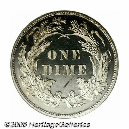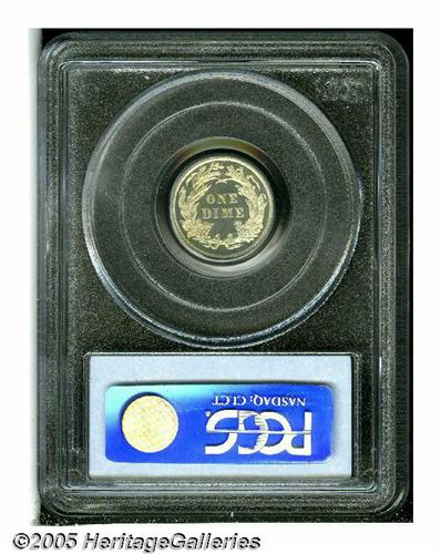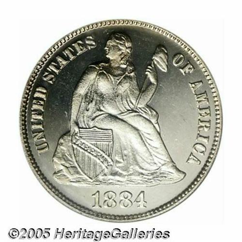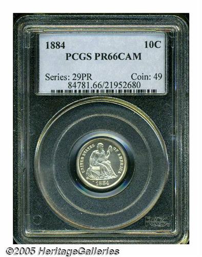 <B>1884<10C> PR66 Cameo PCGS.</B></I> While both proof and business strike 1884 Dimes are a common item with 875 and 3.36 million pieces struck respectively in each format, it is most uncommon to locate an example with surfaces that are as immaculately preserved as this piece. Almost flawless, each side is deeply mirrored in the fields, and the virtual absence of toning greatly enhances the cameo effect. For identification purposes, a couple of small grease stains are seen under DIME in the reverse field. An enchanting type coin. Population: 11 in 66 Cameo, 7 finer (4/05).