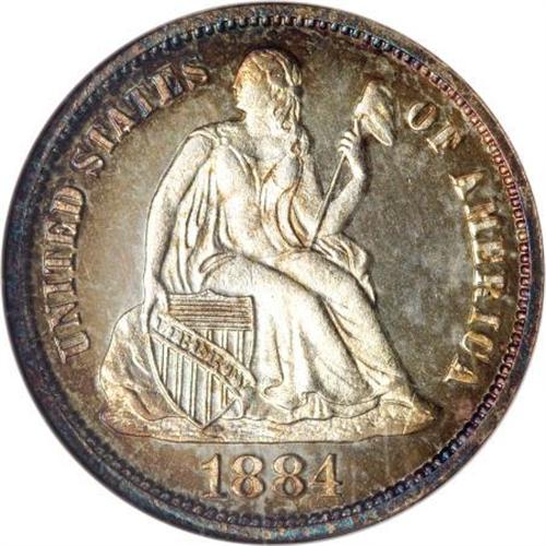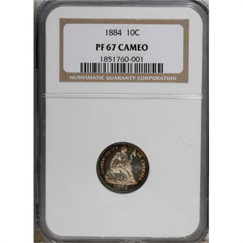<B>1884 10C PR67 Cameo NGC.</B></I> Both sides of this Superb proof have wonderful gold and lilac toning along the borders, framing silver brilliance at the centers. All of the design elements on both sides are bold and the surfaces are pristine. The devices have frosty luster and the fields have deep mirrors, creating the cameo appearance that is so highly prized by today's collectors.<BR><BR><b>Shipping:</b> Coins & Currency (<a target="_blank" href="http://www.heritageauctions.com/common/shipping.php">view shipping information</a>)