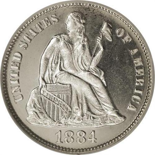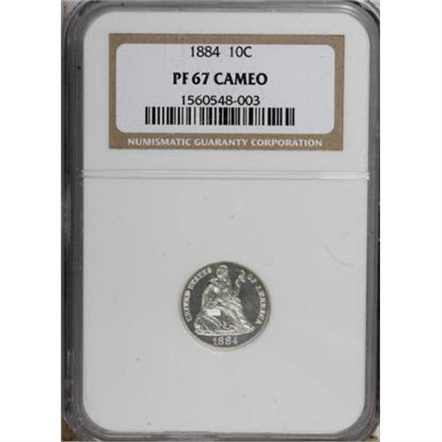 <B>1884 10C PR67 Cameo NGC.</B></I> The 1884 proof dime was struck to the tune of 875 pieces. NGC and PCGS combined have graded several hundred examples, and given the Cameo label to approximately 85 specimens. Crisply struck, frosted motifs stand out against the backdrop of deep mirrored fields, and the white surfaces are devoid of significant marks. Census: 16 in 67 Cameo, 3 finer (6/07).<BR><BR><b>Shipping:</b> Coins & Currency (<a target="_blank" href="http://www.heritageauctions.com/common/shipping.php">view shipping information</a>)
