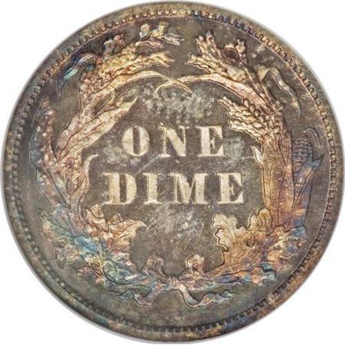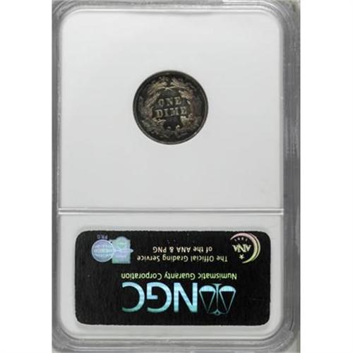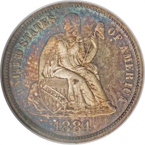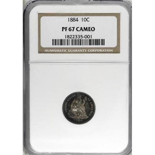 <B>1884 10C PR67 Cameo NGC.</B></I> Mildly frosted design features are highlighted by reflective fields, irrespective of the angle from which the coin is viewed. Splashes of cobalt-blue and lavender toning compete for territory with champagne patina on impeccably preserved surfaces that exhibit well struck motifs. Census: 16 in 67 Cameo, 3 finer (6/07). <BR><BR><b>Shipping:</b> Coins & Currency (<a target="_blank" href="http://www.heritageauctions.com/common/shipping.php">view shipping information</a>\)