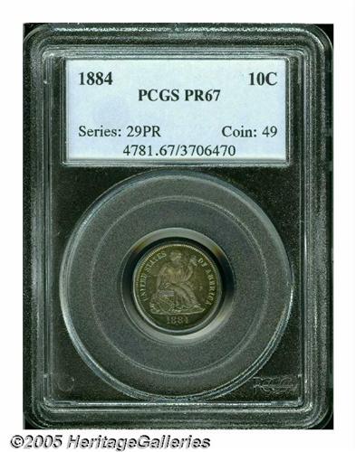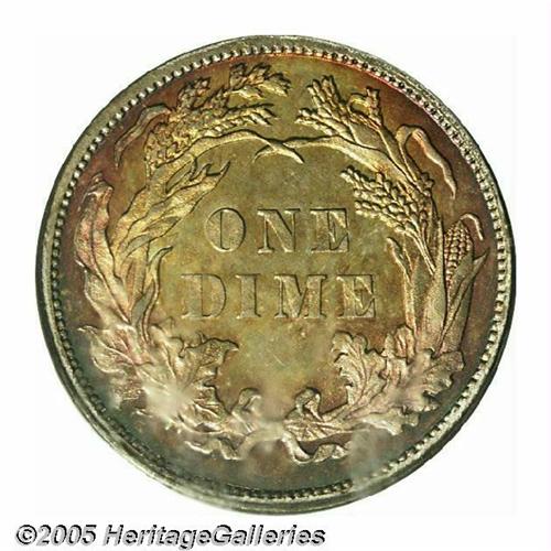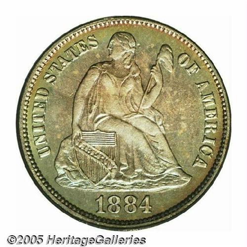 <B>1884<10C> PR67 PCGS.</B></I> While both proofs and business strike 1884 Dimes are a common item with 875 and 3.36 million pieces struck respectively in each format, it is most uncommon to locate an example with surfaces that are as nicely preserved as this piece. Both sides of this exquisite specimen are deeply reflective beneath deep, rich cobalt-blue, golden, and crimson-red toning. The surfaces retain their mark-free appearance even under a loupe and the devices are crisply defined throughout. A coin with both technical and aesthetic merits. Population: 12 in 67, 3 finer (6/05).<BR><I>From The Melrose Bay Collection.</B></I>