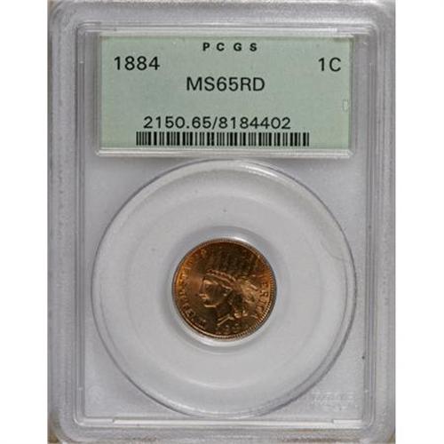 <B>1884 1C MS65 Red PCGS.</B></I> This meticulously struck and lustrous Indian cent alternates between orange-red and yellow-gold. Wispy contact on the cheekbone precludes a finer grade. Encapsulated in a green label holder.<BR><BR><b>Shipping:</b> Coins & Currency (<a target="_blank" href="http://www.heritageauctions.com/common/shipping.php">view shipping information</a>)