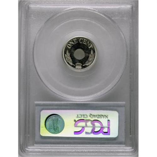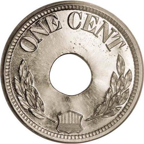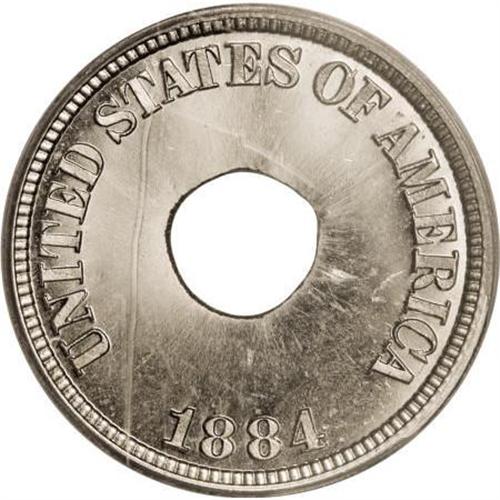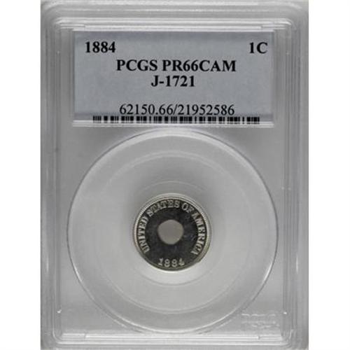 <B>1884 1C One Cent, Judd-1721, Pollock-1929, R.5, PR66 Cameo PCGS.</B></I> Eastman Johnson's "holey" design for the cent with the center perforated with an irregular circumference. These experimental pieces were intended to make small denomination coinage easier to distinguish by the blind, and thereby to "remedy the inconvenience of similarity in our small coin." The obverse bears the legend UNITED STATES OF AMERICA about the upper rim and the date at the bottom. The reverse shows the denomination ONE CENT at the top with an inverted shield and two laurel sprigs below. Struck in nickel with a plain edge. This brightly mirrored specimen is spot-free and can be identified by a lint mark beneath RI in AMERICA.<BR><BR><b>Shipping:</b> Coins & Currency (<a target="_blank" href="http://www.heritageauctions.com/common/shipping.php">view shipping information</a>\)