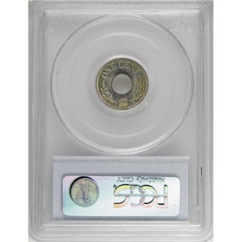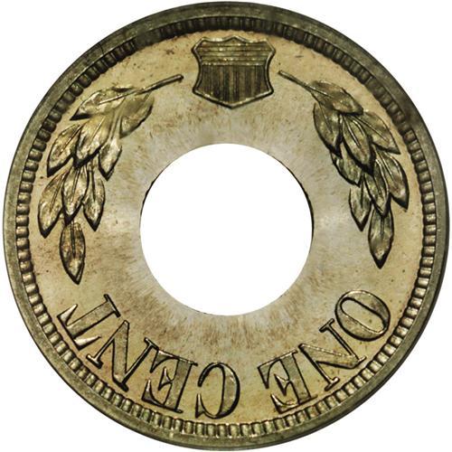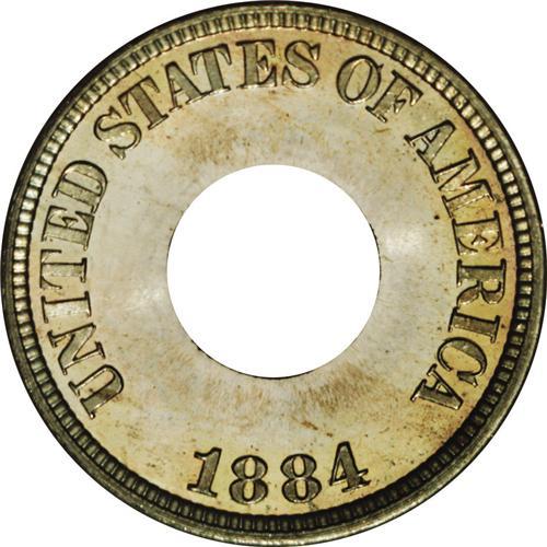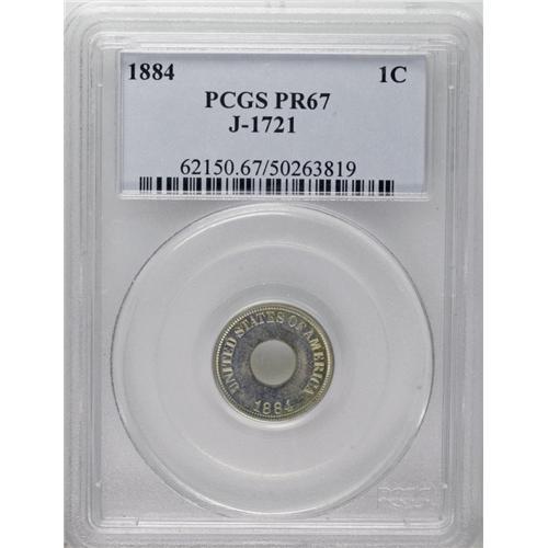 <B>1884 1C One Cent, Judd-1721, Pollock-1929, R.5, PR67 PCGS.</B></I> This "holey" cent is believed to be inspired by Eastman Johnson, a contemporary artist of some fame who encountered world coins with center holes during his travels. The hole forces simple designs, consisting of statutory legends, a small Union shield, and a pair of olive (?) branches. Struck in nickel with a plain edge. A gorgeous honey-gold Superb Gem with radiant and undisturbed surfaces.<BR><BR><b>Shipping:</b> Coin/Currency (<a target="_blank" href="http://www.heritageauctions.com/common/shipping.php">view shipping information</a>)