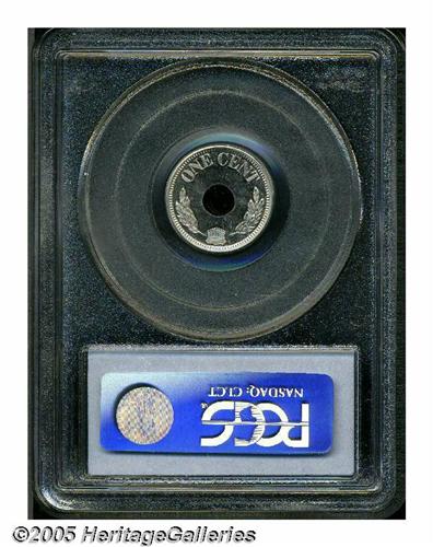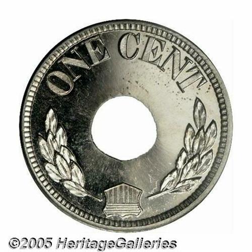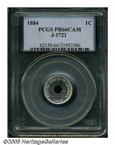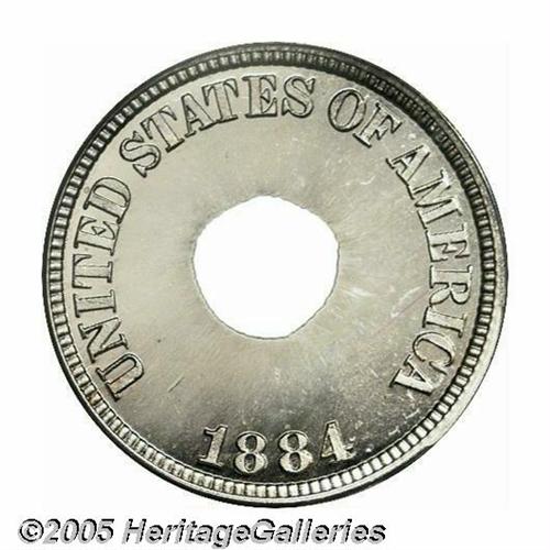 <B>1884<1C> One Cent, Judd-1721, Pollock-1929, R.5, PR66 Cameo PCGS.</B></I> Eastman Johnson's "holey" design for the cent with the center perforated with an irregular circumference. These experimental pieces were intended to make small denomination coinage easier to distinguish by the blind, and thereby to "remedy the inconvenience of similarity in our small coin." The obverse bears the legend UNITED STATES OF AMERICA about the upper rim and the date at the bottom. The reverse shows the denomination ONE CENT at the top with an inverted shield and two laurel sprigs below. Struck in nickel with a plain edge. This brightly mirrored specimen is spot-free and can be identified by a lint mark beneath RI in AMERICA.