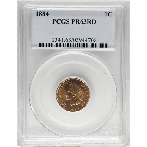 <B>1884 1C PR63 Red PCGS.</B></I> PCGS Population (4/135). NGC Census: (2/96). Mintage: 3,942. Numismedia Wsl. Price for NGC/PCGS coin in PR63: $258. (#2341)<BR><BR><b>Shipping:</b> Coins & Currency (<a target="_blank" href="http://www.heritageauctions.com/common/shipping.php">view shipping information</a>)