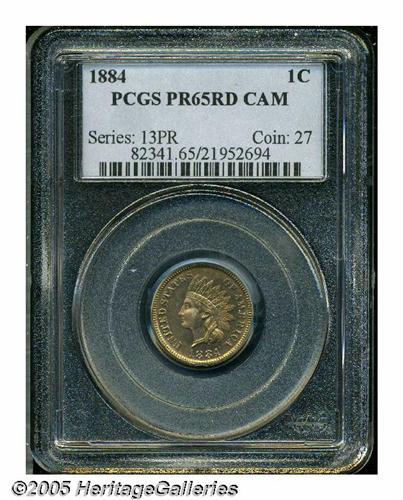 <B>1884<1C> PR65 Red Cameo PCGS.</B></I> A fully brilliant and highly attractive Gem Cameo Proof with exquisite design details and deeply mirrored fields. Few finer cameo examples have been certified by PCGS. The surfaces on both sides have bright orange mint color, with a few tiny spots on the obverse. Population: 4 in 65, 4 finer (5/05).