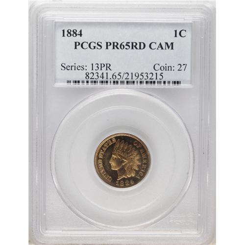 <B>1884 1C PR65 Red Cameo PCGS.</B></I> While a common date in proof format (3,942 proofs were made in this year), it is uncommon with cameo contrast as seen on this coin, where bright, reflective fields highlight the mildly frosted design elements. A powerful strike imparts crisp definition on the feathertips and on the ribbing of the reverse wreath, and all four diamonds are outlined, though the second one from the top is slightly soft on the right side. Well preserved on both sides. Population: 2 in 65 Red, 3 finer (1/07).<BR><BR><b>Shipping:</b> Coins & Currency (<a target="_blank" href="http://www.heritageauctions.com/common/shipping.php">view shipping information</a>)