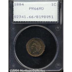 <B>1884<1C> PR66 Red PCGS.</B></I> This radiant cherry-red premium Gem has an exquisite strike and is seemingly free from contact. A carbon fleck is carefully concealed within one of the headdress feathers. The lower loops of the 8s in the date are lightly repunched. Housed in a first generation PCGS holder. Population: 30 in 66, 10 finer (7/04). <BR><BR><B>Important notice:</B> Heritage usually auctions material at the rate of 200-250 lots per hour. On some occasions eBay Live bid software or the Internet may not be able to keep up with the pace of the auction. We recommend placing a realistic absentee bid now as insurance to avoid disappointment. Occasionally the auctioneer may eliminate or reject an eBay Live bid, and the auctioneer may also reopen a lot after the close of the eBay live bidding (usually because we missed an audience bid), and may reject your bid even if it shows you as the winning bidder. By bidding via eBay Live, you agree that Heritage may award the lot to another bidder at its sole discretion under the circumstances described above or any other reasonable circumstances. Since eBay bids are not shown to us until we open the lot on the floor, we treat those bids just like floor bids. In most cases the floor responds before the eBay bid is presented to us, due to Internet lag time, so for consistency we have made it a policy that floor bids are always considered first over tie eBay live bids. Also please note that all Heritage lots purchased through eBay Live carry a 20% Buyer's Premium. Please make sure you read the Terms and Conditions before you bid. </span></font></tr></table></td></tr></table>
