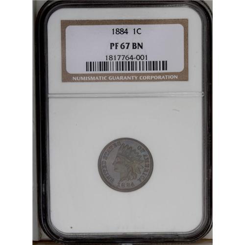 <B>1884<1C> PR67 Brown NGC.</B></I> The chocolate-brown surfaces are evenly toned with blue highlights. This Superb Gem's exceptional level of detail leaves no doubt as to this coin's proof status.