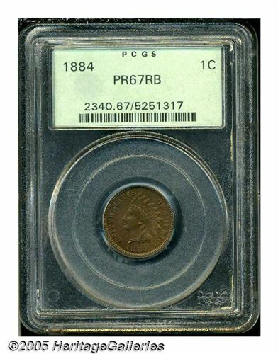 <B>1884<1C> PR67 Red and Brown PCGS.</B></I> Blended peach and olive colors dominate the obverse, while the reverse features an orange center and greenish-gold borders. This exquisitely struck Superb Gem is perfect aside from a few pinpoint toning flecks near the denomination. Encapsulated in a green label holder.