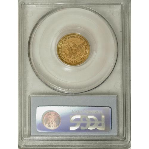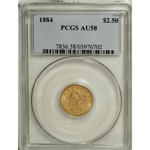 <B>1884 $2 1/2 AU58 PCGS.</B></I> A needle-sharp Borderline Uncirculated rare date quarter eagle with plentiful yellow-gold and aqua luster. The few light marks are unimportant for the grade. A mere 1,950 pieces were struck for this unheralded rarity. Population: 17 in 58, 29 finer (3/07).<BR><BR><b>Shipping:</b> Coins & Currency (<a target="_blank" href="http://www.heritageauctions.com/common/shipping.php">view shipping information</a>)