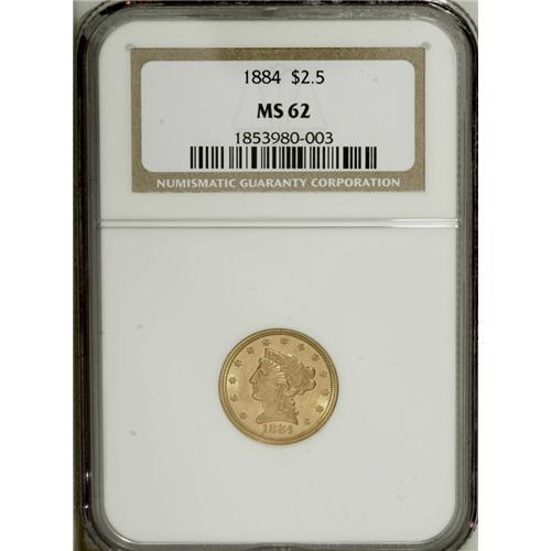 <B>1884 $2 1/2 MS62 NGC.</B></I> A meticulously struck example of this underappreciated and low mintage issue. A mere 1,950 business strikes fell from the dies. This piece has substantial luster and no obvious marks.<BR><BR><b>Shipping:</b> Coins & Currency (<a target="_blank" href="http://www.heritageauctions.com/common/shipping.php">view shipping information</a>)