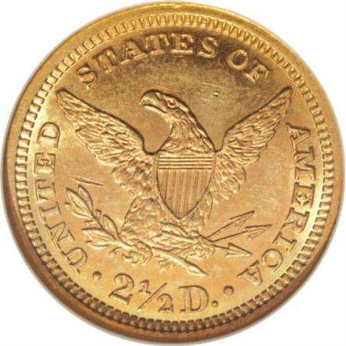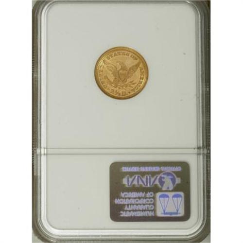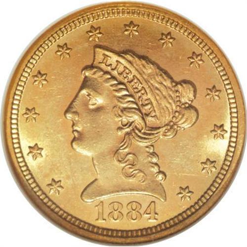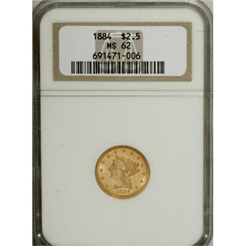 <B>1884 $2 1/2 MS62 NGC.</B></I> As is the case with other 1880s quarter eagle issues, the 1884 was little saved, has a tiny mintage, and has few adherents. That makes the 1884 one of the better bargains in U.S. numismatics. This is a sharply struck and lustrous lime-gold example held back in grade by a small mark above olive branch. Just 1,950 pieces were struck. Census: 10 in 62, 15 finer (6/07).<BR><BR><B>Coin Engraver:</B> Christian Gobrecht<BR><BR><b>Shipping:</b> Coins & Currency (<a target="_blank" href="http://www.heritageauctions.com/common/shipping.php">view shipping information</a>\)