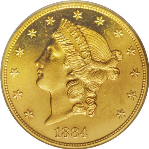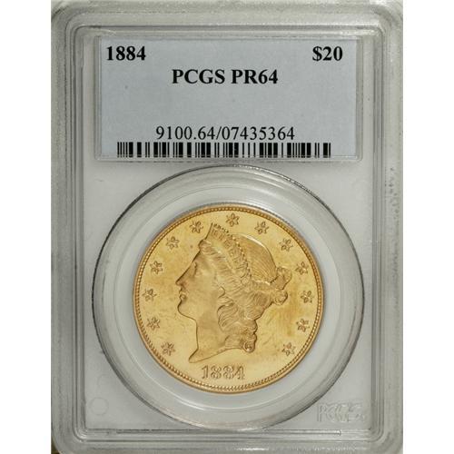 <B>1884 $20 PR64 PCGS.</B></I> An issue that needs no introduction among gold specialists, the 1884 was produced solely in specimen, or proof format. The official mintage is 71 coins, which is fewer than those of the proof-only 1883 and 1887 deliveries. The 1884 is the rarest issue of this trio, but just <I>how</B></I> rare has been a matter of debate within numismatic circles. For years, Walter Breen's estimate of 16-20 pieces extant was widely accepted as fact. However, Mike Fuljenz and Doug Winter offer a range of just 15-17 coins in the 2000 book <I>Type Three Double Eagles 1877-1907: A Numismatic History and Analysis.</B></I> David W. Akers believed only 13-15 pieces remain, and wrote that "as a date, the 1884 is the second rarest in the entire Liberty head double eagle series after the excessively rare 1861 Paquet." There can be no doubt that our offering of the present specimen represents a numismatic event of undeniable significance.<BR> We are aware of only six 1884 double eagles in auctions over the past ten years:<BR><BR> 1. Ex: Harry W. Bass, Jr. Collection (Bowers and Merena, 10/1999), lot 1891, where it realized $46,000. This coin, previously from the Garrett collection, was certified PR63 by PCGS. It appeared again as lot 7590 in Heritage's Jan. 2004 Long Beach Signature, where it realized $103,500.<BR><BR> 2 Ex: Eagle Collection of Double Eagles (Heritage, 1/2002), lot 4149, where it realized $54,625.<BR><BR> 3 Superior (8/2002), lot 2228, where it realized $51,750. Cataloged as "Brilliant Proof 63."<BR><BR> 4 Ex: FUN Signature Sale Platinum Night--The North Shore Collection (Heritage, 1/2004), lot 3225, where it realized $149,500. An exquisite NGC PR66 Cameo specimen. Earlier, in the Dallas Bank Collection (Stack's/Sotheby's, 10/2001) as lot 94, which realized $48,875.<BR><BR> 5 Ex: Heritage (6/2004), lot 6376, which realized $126,500. Certified PR64 by PCGS.<BR><BR> 6 Ex: Richmond Collection, Part I (David Lawrence, 7/2004), lot 2330, which brought $115.000. Certified PR64 Cameo by NGC.<BR><BR> The present piece is #5 on this list. Although undesignated as Cameo by PCGS, the devices exhibit substantial frost, particularly on the eagle's wings and Liberty's hair. The frost is thick throughout the right half of the neck and near the ear, and minimal on the cheek and neck. This frost pattern is diagnostic of 1884 proofs, and also explains why no proof 1884 double eagles have been certified as Deep Cameo or Ultra Cameo. Another diagnostic for the issue is a diagonal die line to the left of the Y in LIBERTY, which is present on the current lot. Intricately struck, even on the highpoints of the hair to the right of the ear. Attractively toned with dashes of lemon patina. Minor planchet flaws near the nose, the forehead, the vertical shield lines, and the A in STATES provide pedigree identifiers. This very rare proof double eagle would be a standout within even the finest collection of Liberty double eagles.<BR><I>From The Dr. Robert J. Loewinger Collection.</B></I><BR><BR><b>Shipping:</b> Coin/Currency (<a target="_blank" href="http://www.heritageauctions.com/common/shipping.php">view shipping information</a>) <BR><BR><B>Importan