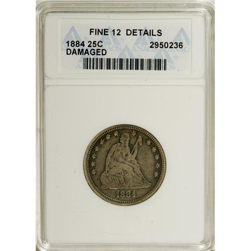 <B>1884 25C --Damaged--ANACS. Fine 12 Details.</B></I> NGC Census: (0/77). PCGS Population (0/95). Mintage: 8,000. Numismedia Wsl. Price: $250. (#5516)<BR><BR><b>Shipping:</b> Coins & Currency (<a target="_blank" href="http://www.heritageauctions.com/common/shipping.php">view shipping information</a>)