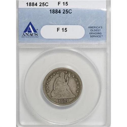 <B>1884 25C F15 ANACS.</B></I> NGC Census: (1/74). PCGS Population (2/93). Mintage: 8,000. Numismedia Wsl. Price for NGC/PCGS coin in F15: $268. (#5516)<BR><BR><B>Coin Engraver:</B> Christian Gobrecht<BR><BR><b>Shipping:</b> Coins & Currency (<a target="_blank" href="http://www.heritageauctions.com/common/shipping.php">view shipping information</a>)