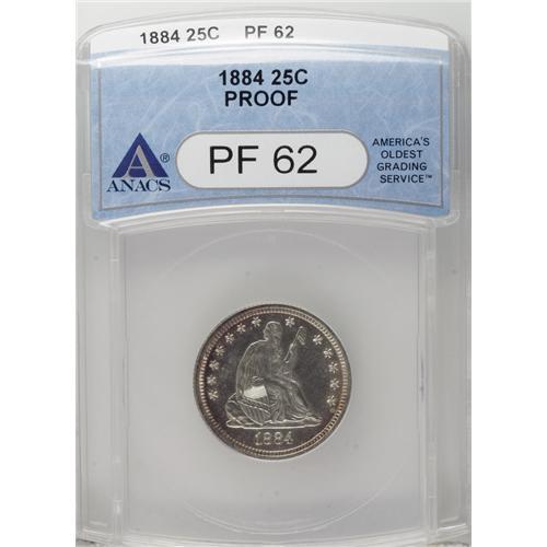 <B>1884 25C PR62 ANACS.</B></I> NGC Census: (10/202). PCGS Population (28/187). Mintage: 875. Numismedia Wsl. Price for NGC/PCGS coin in PR62: $379. (#5585)<BR><BR><b>Shipping:</b> Coin/Currency (<a target="_blank" href="http://www.heritageauctions.com/common/shipping.php">view shipping information</a>)