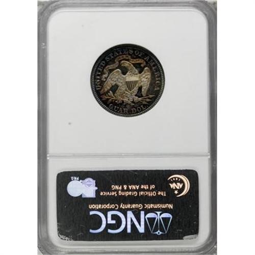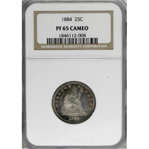 <B>1884 25C PR65 Cameo NGC.</B></I> Forest-green, tan-gold, and rose toning graces the obverse periphery. The reverse toning is even more dramatic, since the reverse has deep electric-blue and ruby-red borders and a peach-gold center. Among the lowest mintage dates of the series, with 875 proofs and 8,000 business strikes issued.<BR><BR><b>Shipping:</b> Coins & Currency (<a target="_blank" href="http://www.heritageauctions.com/common/shipping.php">view shipping information</a>\)