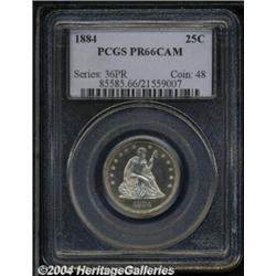 <B>1884<25C> PR66 Cameo PCGS.</B></I> Smooth, glassy fields form a splendid backdrop to the sharply defined and chalky devices of this well contrasted Gem. Streaky golden-orange patina is most obvious when the coin is tilted at a slight angle. Population: 7 in 66 Cameo, 3 finer (3/04).<BR><I>Ex: Kreisberg, Schulman Sale (5/66), lot 2028, where it brought $83.</B></I> <BR><BR><B>Important notice:</B> Heritage usually auctions material at the rate of 200-250 lots per hour. On some occasions eBay Live bid software or the Internet may not be able to keep up with the pace of the auction. We recommend placing a realistic absentee bid now as insurance to avoid disappointment. Occasionally the auctioneer may eliminate or reject an eBay Live bid, and the auctioneer may also reopen a lot after the close of the eBay live bidding (usually because we missed an audience bid), and may reject your bid even if it shows you as the winning bidder. By bidding via eBay Live, you agree that Heritage may award the lot to another bidder at its sole discretion under the circumstances described above or any other reasonable circumstances. Since eBay bids are not shown to us until we open the lot on the floor, we treat those bids just like floor bids. In most cases the floor responds before the eBay bid is presented to us, due to Internet lag time, so for consistency we have made it a policy that floor bids are always considered first over tie eBay live bids. Also please note that all Heritage lots purchased through eBay Live carry a 20% Buyer's Premium. Please make sure you read the Terms and Conditions before you bid.