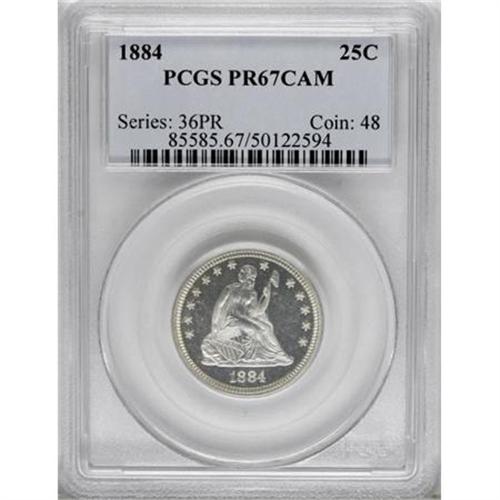 <B>1884 25C PR67 Cameo PCGS.</B></I> Pleasing contrast between the icy devices and mirrored fields confirms the exemplary eye appeal of this precisely struck and fully brilliant Superb Gem. A pristine specimen worthy of an outstanding Registry Set. Only 875 proofs and 8,000 business strikes were issued. Population: 4 in 67 Cameo, 0 finer (11/07).<BR><I>From The Parker Lee III Collection.</B></I><BR><BR><b>Shipping:</b> Coins & Currency (<a target="_blank" href="http://www.heritageauctions.com/common/shipping.php">view shipping information</a>)