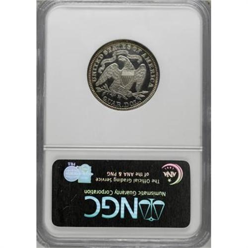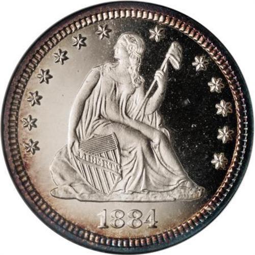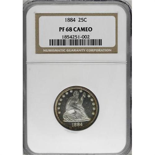 <B>1884 25C PR68 Cameo NGC.</B></I> Writing about the 1884 proof quarters in his <I>Encyclopedia of United States and Colonial Proof Coins</B></I>, Walter Breen says: "... the first strikes I have seen have mostly shown inferior surfaces (often peppered with tiny nicks), poor borders and shallow relief details compared with any proofs of the period."<BR> The PR68 specimen we offer in this lot digresses significantly from Breen's profile. Sharply impressed, heavily frosted design elements stand amidst deeply mirrored fields, and crisply defined, dentiled borders completely encircle the faces of both sides. Whispers of cobalt-blue, purple, and golden-tan patination gravitate to the rim areas, being better defined and displaying deeper hues on the obverse. A few tiny planchet flakes in the fields do not distract in the least. Census: 2 in 68 Cameo, 1 finer (6/07).<BR><BR><b>Shipping:</b> Coins & Currency (<a target="_blank" href="http://www.heritageauctions.com/common/shipping.php">view shipping information</a>\)