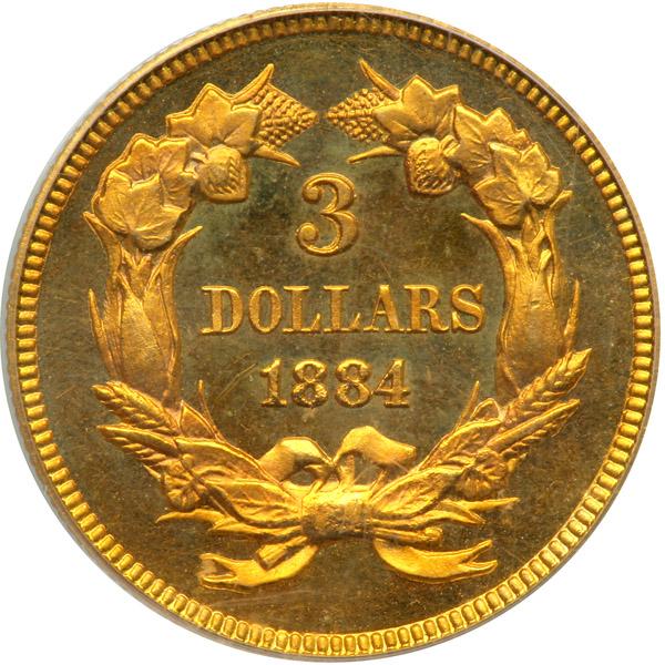 1884. PCGS graded Proof 65 CAC Approved. A stunning gem proof exhibiting natural rich golden toning throughout. In an OGH (Old Green Holder). Only 106 struck. PCGS #04592497. Lovely rich golden toning on both sides. A visually striking Gem Proof of the date, here with unfrosted motifs yet deeply mirrored fields that display much mint sparkle. An attractive Proof $3 from a mintage whose pieces, rather than being struck all at once, were delivered in groups from the Medal Department at the Mint throughout the year, and as called for by public demand. It may be the case that only 70 or 80 Proofs of the 1884 issue are still extant, which makes for a certain availability when today's collectors desire a delightful specimen for a Proof gold collection. We note here with pleasure rich original toning, which certainly speaks volumes about the inherent quality of this beautiful coin. Pop 7; 2 finer with 1 in 66, 1 in 67 (PCGS # 8048) .