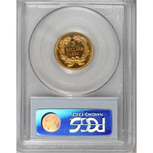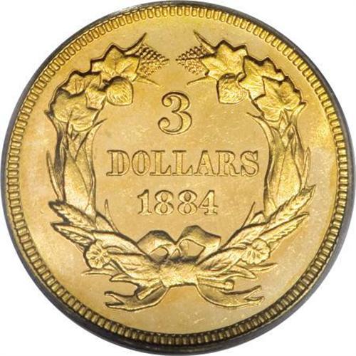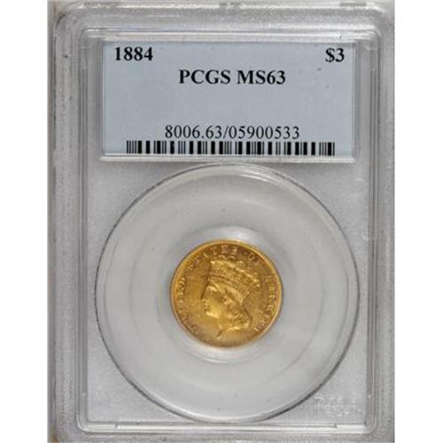 <B>1884 $3 MS63 PCGS.</B></I> While a few examples of this date have been certified at higher grades, it is hard to envision any that have greater aesthetic appeal than this prooflike example. While the ribbon bow on the reverse is slightly flat, all other design elements on both sides are boldly rendered. The usual quota of tiny surface marks are reflected in the mirrored fields, but none are of any significance. The 1884 three continues a series of "low mintage dates that characterize the waning years of this denomination," according to Jeff Garrett and Ron Guth. Population: 21 in 63, 26 finer (8/07).<BR><BR><B>Coin Engraver:</B> James B. Longacre<BR><BR><b>Shipping:</b> Coins & Currency (<a target="_blank" href="http://www.heritageauctions.com/common/shipping.php">view shipping information</a>)