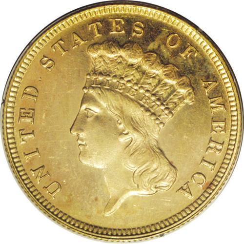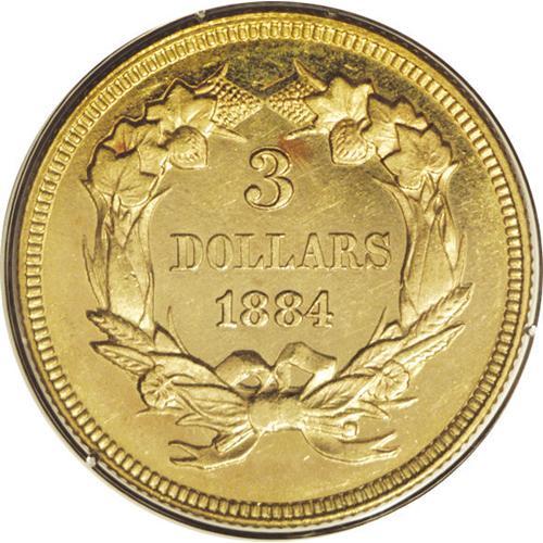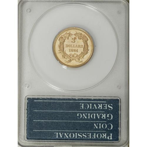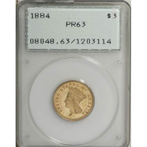 <B>1884 $3 PR63 PCGS.</B></I> Proof mintages for the waning years of this series saw growth even as business-strike production fell to nominal figures. For example, the 106 proof specimens of 1884 stack up against a mere 1,000 business strikes. This is a slightly hazy gold-orange representative that has modest reflectivity and a modicum of contrast where the fields are unclouded. Light hairlines and contact, including a sinuous mark that extends from the chin, account for the grade. Housed in a first-generation holder. Population: 6 in 63, 25 finer (12/06).<BR><BR><b>Shipping:</b> Coin/Currency (<a target="_blank" href="http://www.heritageauctions.com/common/shipping.php">view shipping information</a>)