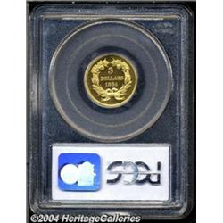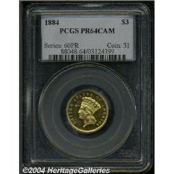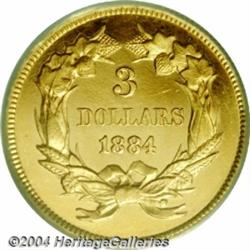 <B>1884<$3> PR64 Cameo PCGS.</B></I> The radiant devices exhibit pleasing contrast with the mirrored fields. A well struck and beautifully preserved near-Gem. A faint handling mark below MER in AMERICA denies an even finer assessment. Mint-made die polishing has attenuated the details of Liberty's crown. Three Dollar Gold pieces were no longer required for commerce by 1884, but token mintages continued to be produced every year. One thousand business strikes and 106 proofs were issued. Population: 3 in 64, 2 finer (3/04). <BR><BR><B>Important notice:</B> Heritage usually auctions material at the rate of 200-250 lots per hour. On some occasions eBay Live bid software or the Internet may not be able to keep up with the pace of the auction. We recommend placing a realistic absentee bid now as insurance to avoid disappointment. Occasionally the auctioneer may eliminate or reject an eBay Live bid, and the auctioneer may also reopen a lot after the close of the eBay live bidding (usually because we missed an audience bid), and may reject your bid even if it shows you as the winning bidder. By bidding via eBay Live, you agree that Heritage may award the lot to another bidder at its sole discretion under the circumstances described above or any other reasonable circumstances. Since eBay bids are not shown to us until we open the lot on the floor, we treat those bids just like floor bids. In most cases the floor responds before the eBay bid is presented to us, due to Internet lag time, so for consistency we have made it a policy that floor bids are always considered first over tie eBay live bids. Also please note that all Heritage lots purchased through eBay Live carry a 20% Buyer's Premium. Please make sure you read the Terms and Conditions before you bid. </span></font></tr></table></td></tr></table>