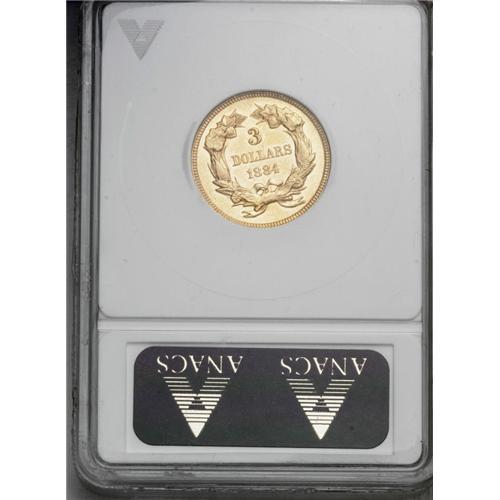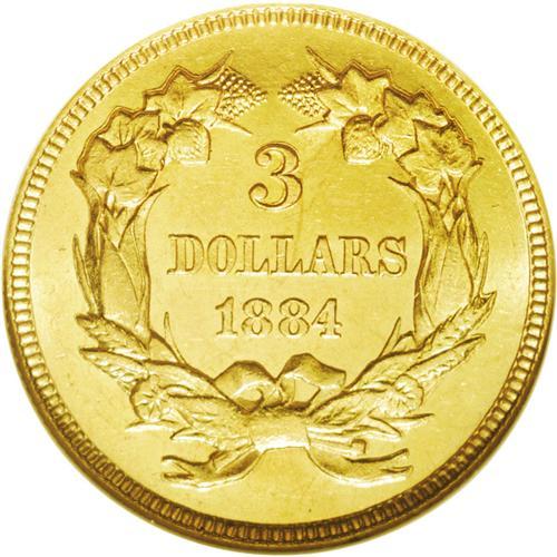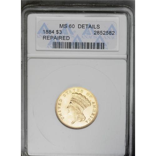 <B>1884<$3>--Repaired--ANACS. MS60 Details.</B></I> To the untrained eye, this frosty example has the appearance of an unimpaired proof. Examination beneath a glass reveals extensive smoothing of the obverse field and Liberty's chin. Only 1,000 commercial strikes and 106 proofs were produced for this difficult issue. Examples were not set aside; for example, NGC has certified just 43 business strikes in all grades.