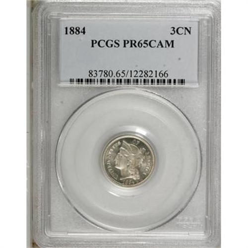 <B>1884 3CN PR65 Cameo PCGS.</B></I> . PCGS Population (42/66). NGC Census: (35/53). (#83780)<BR><BR><b>Shipping:</b> Coins & Currency (<a target="_blank" href="http://www.heritageauctions.com/common/shipping.php">view shipping information</a>)