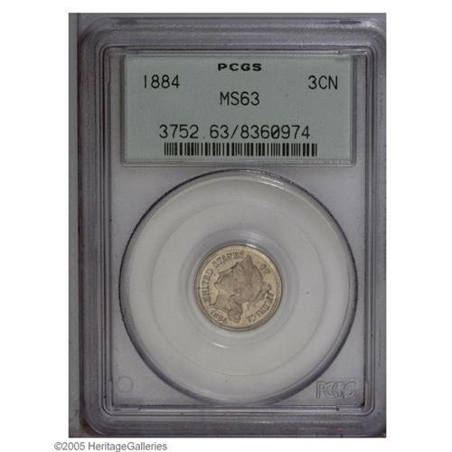 <B>1884<3CN> MS63 PCGS.</B></I> Frosty with a virtually untoned silver-gray appearance. One of the most difficult of all business strike three-cent nickel issues, from a mintage of just 1,700 pieces.